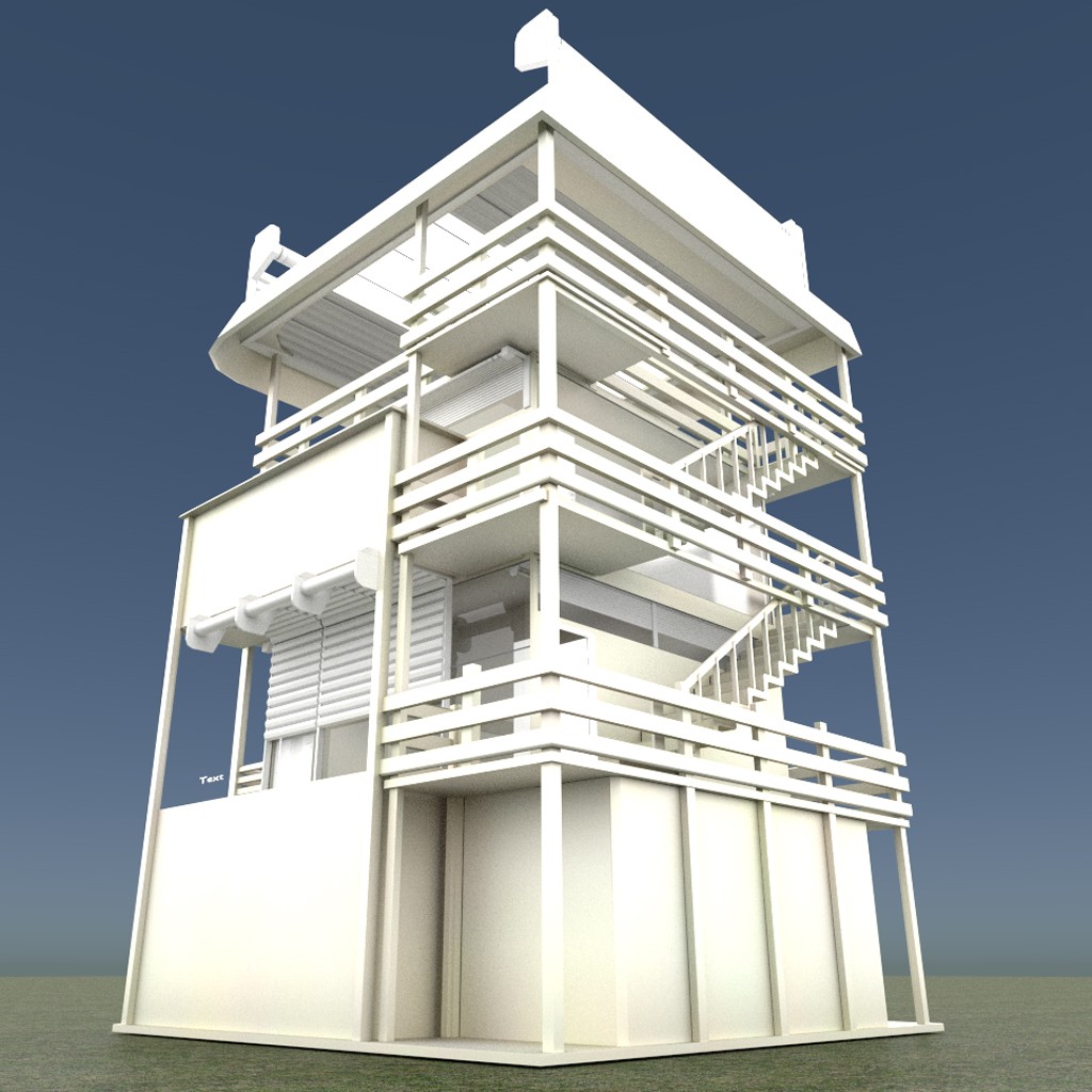 Here is my tower-house design with some window blinds and animated roller shutters.