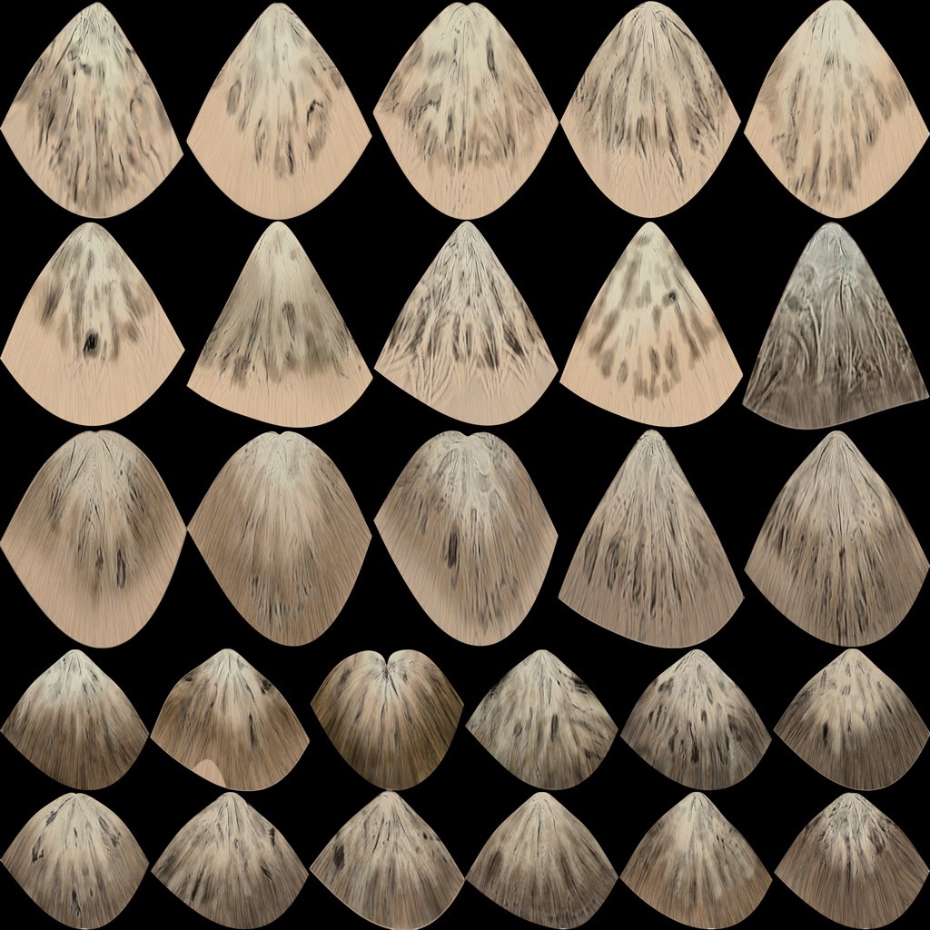The objects share 3 2k textures between them, color, normal and specular. 15 of the teeth are UV-unwrapped to be more detailed than the rest. These 15 also has one extra subdivision level of multiresolution. If you for some reason want the original 8k textures for these teeth (they don't add much detail, and are pretty overkill), you can download them here