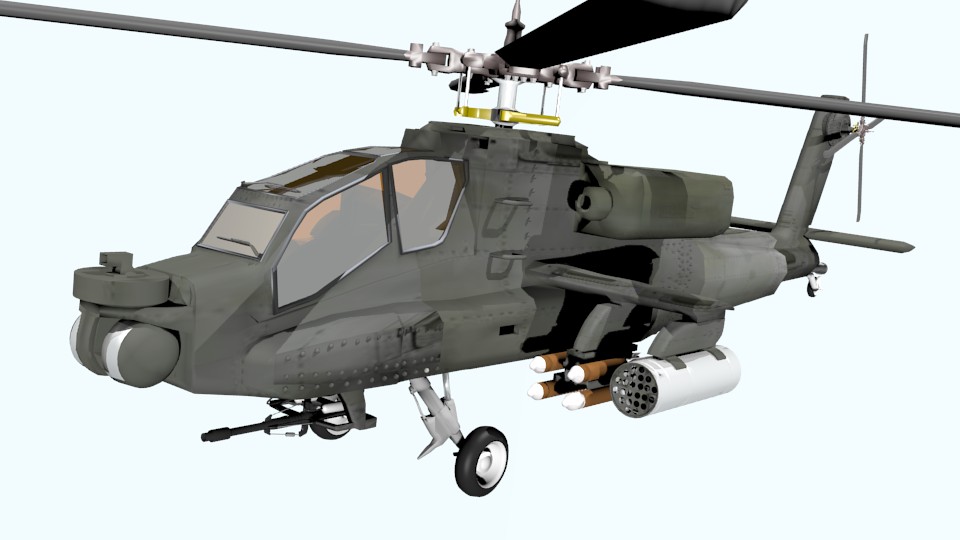 This model of the apache helicopter meets the needs of anyone interested in using an apache helicopter in any blender related field. Owing to the least available .blend files of a similar model, this will always come in handy since it is very easy to work with. It has a few objects thus making it effective when animating, rendering, scripting, compositing etc. It can be used in high detailed videos but it is itself not complicated. Enjoy using it, It is made in Kenya, Africa.