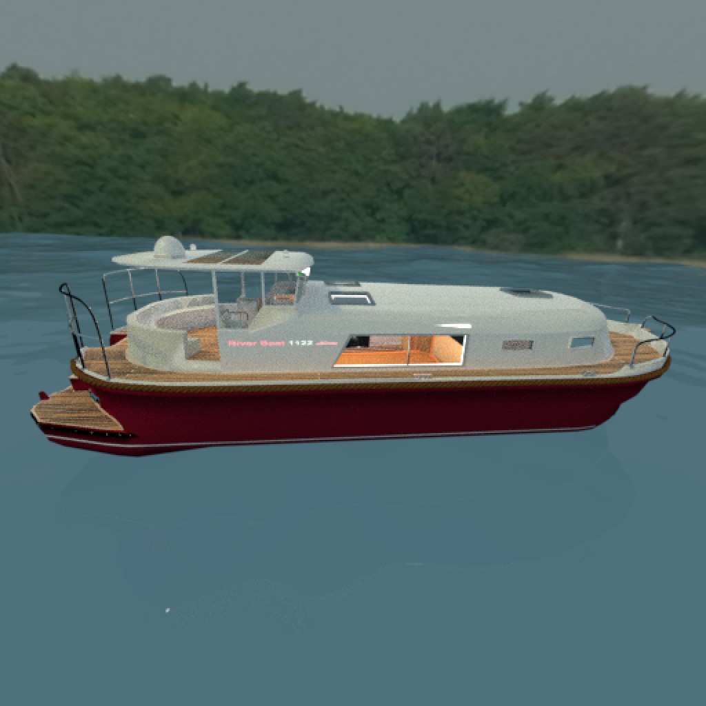 Have fun with this riverboat. The Riverboat 1122 can be hired in Fuerstenberg in Germany. Inside its almost complete. Rendering inside takes a while! The Top is divided from the bottom (2 Layer) but parented. For movement just grab the bottom part. Everything else is connected. Doors can be opend. All textures are nodes. No picture-textures. Sorry, i have no free textures :(. I hope you like it :)
