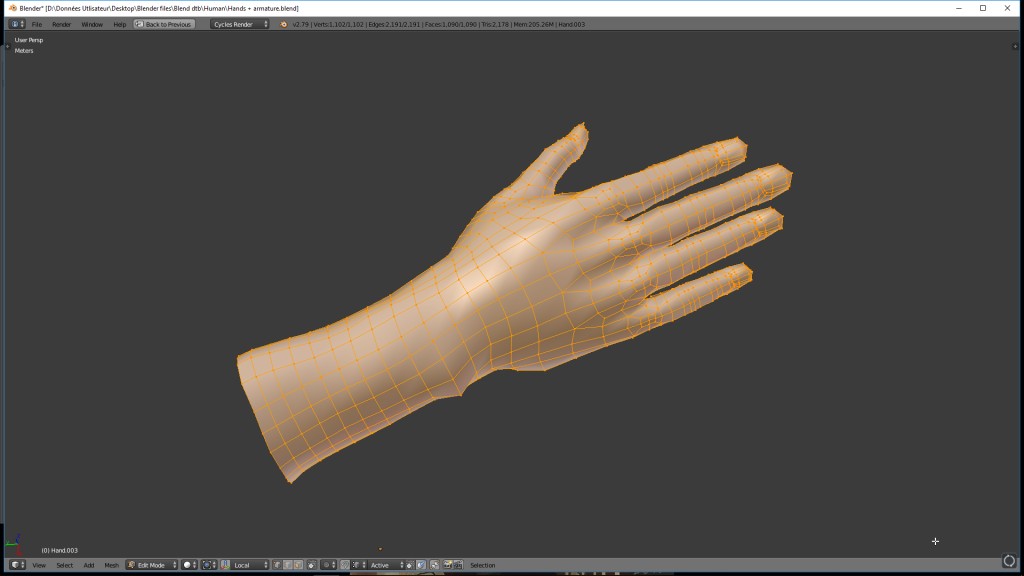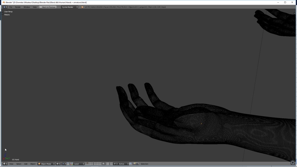 Left and Right human hands with a certain degree of realism. Working armature with a control bone for each individual fingers apart from the thumb. Each bone can be moved independantly. Takes a bit of work to get a good hand pose because hands have so many quirky positions in wich they can be found. No texture provided. The mesh is on a different layer than the armature. The left hand is feminine looking and the right hand is male looking.