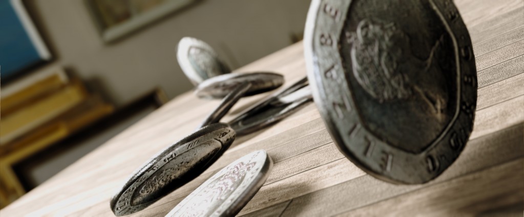 Coins of 20 p swirling around on a table, rendered by EEVEE in Blender 2.80. A short project to improve my material and rendering skills in EEVEE render engine.