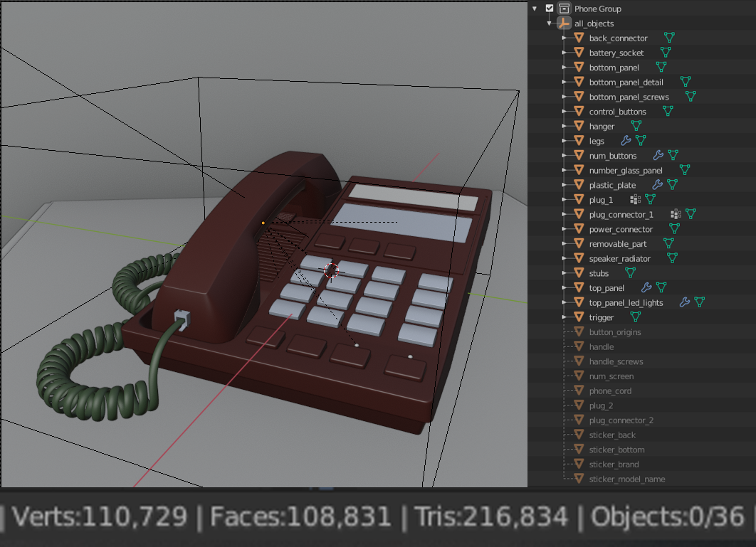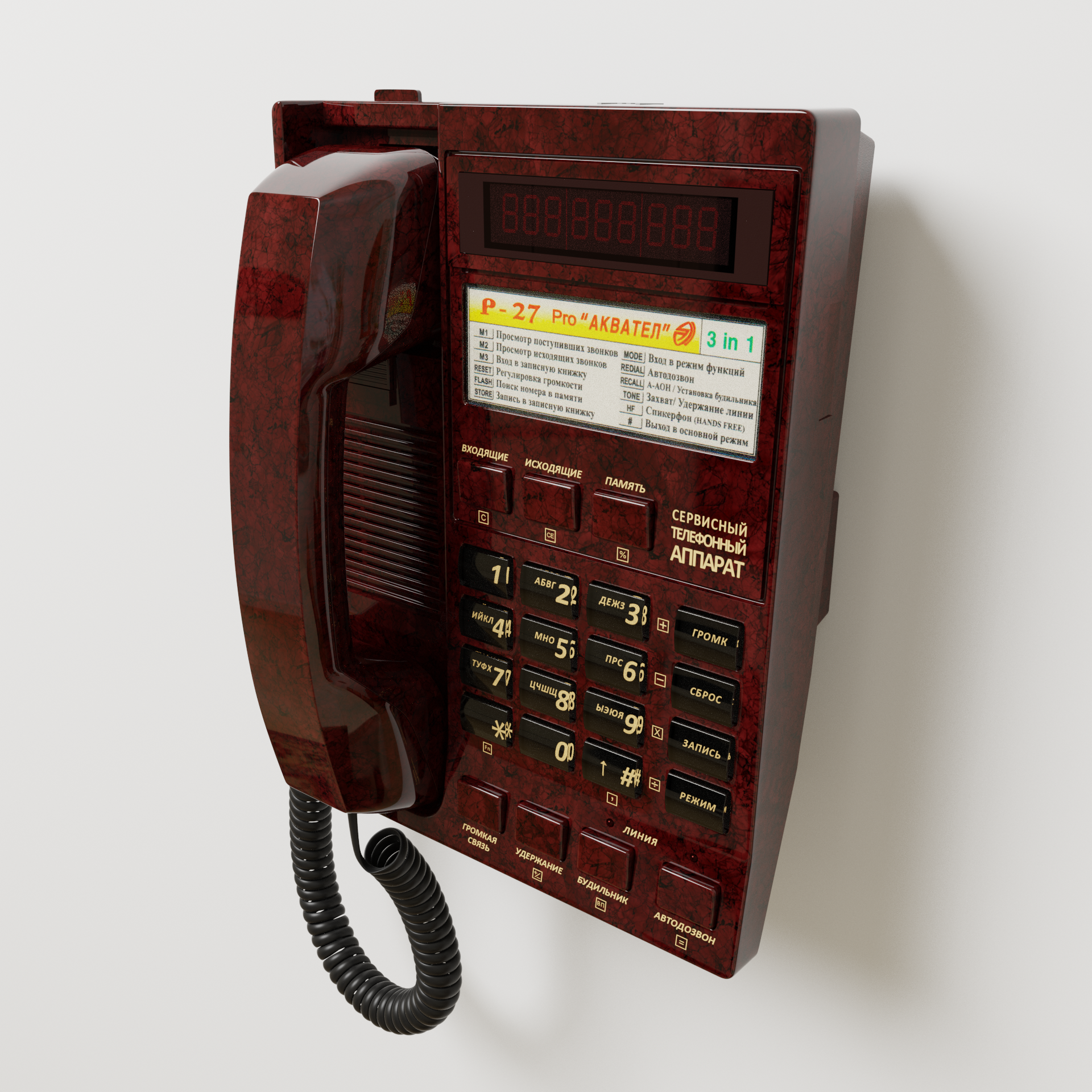 An old phone that I found in a box in my pantry. Red marble texture for plastic parts made in Substance Painter. The texture of the wood for the table is not included in the file.