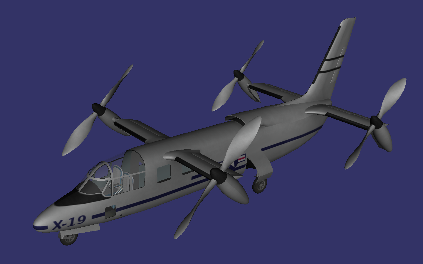 The X-19 is an experimental tilt-rotor vertical take-off and landing aircraft developed by the Curtiss-Wright firm in the 1960s. (source wikipedia)