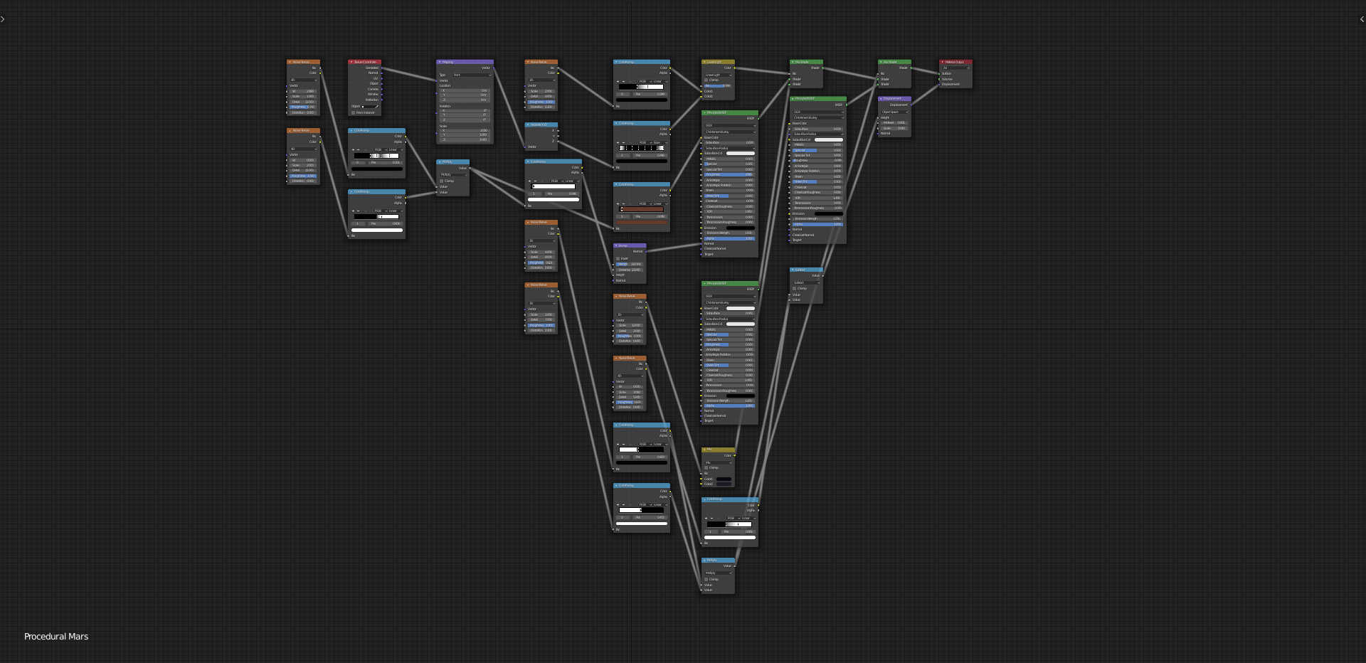 A shader to use as a proxy of a Martian planetary texture. It actually looks more like Duna from KSP. Uses only noise and vector math nodes so it is infinitely scalable. Does not work so well in Eevee, sorry.