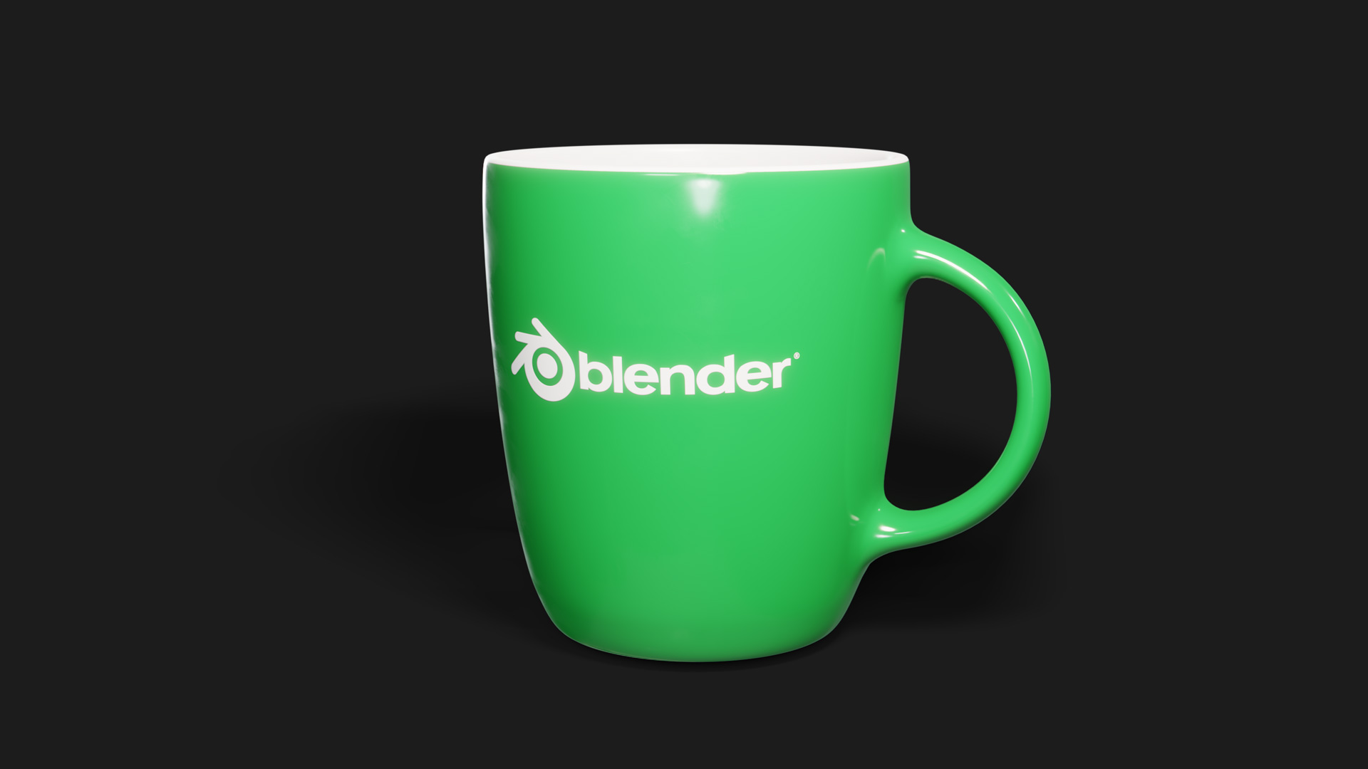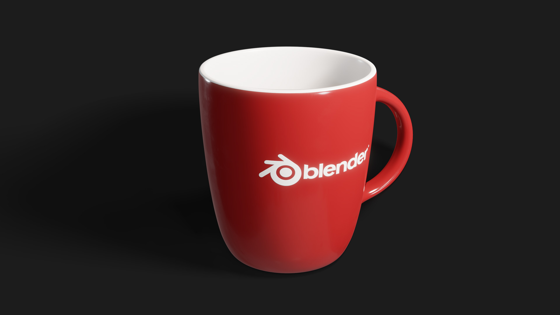 3D model of a coffee mug with Blender logo. UV-mapped and textured. Material nodes are grouped in a handy shader allowing you to quickly control Roughness imperfection effect and Color.
