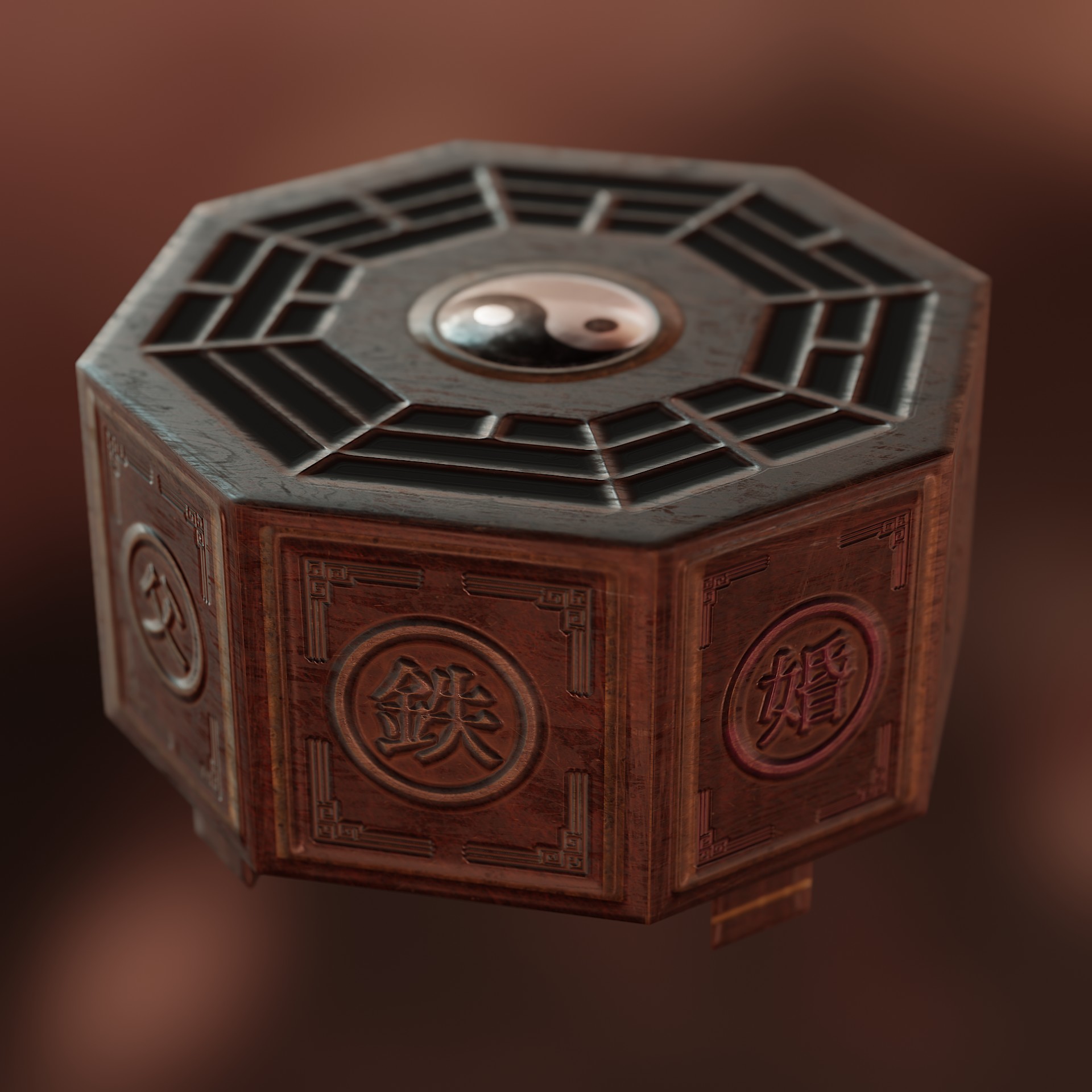 > "The mini-Hakkero (ミニ八卦炉, "mini-Eight Trigram Furnace" or "mini-Elemental Furnace") is a magical device owned by Marisa Kirisame. As revealed in Curiosities of Lotus Asia, it was originally given to Marisa by Rinnosuke Morichika after she stopped living with her parents. The mini-Hakkero takes the shape of a hand-sized octagonal block of wood, with the eight Taoist trigrams inscribed in a circle around its center. The internal components were originally made of iron or steel, but replaced by the mythical hihi'irokane metal after rusting. It is capable of generating immense heat and magical energy--Rinnosuke describes it as capable of reducing a mountain to ashes. Marisa relies on it heavily for research and combat, most notably to power her Master Spark."