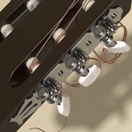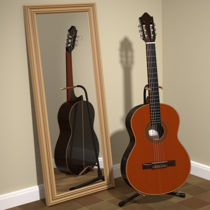 This is a detailed model of classical guitar,(face count is high!). Texures are now set up for cycles. I've put a mirror in, to not double the guitar for the render! I have marked it as fan art as it looks very like the real thing, it is based on a guitar made by "Casa Gonzarlez". I have also put new strings on it.
