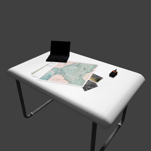 Table with laptop, radio and documents