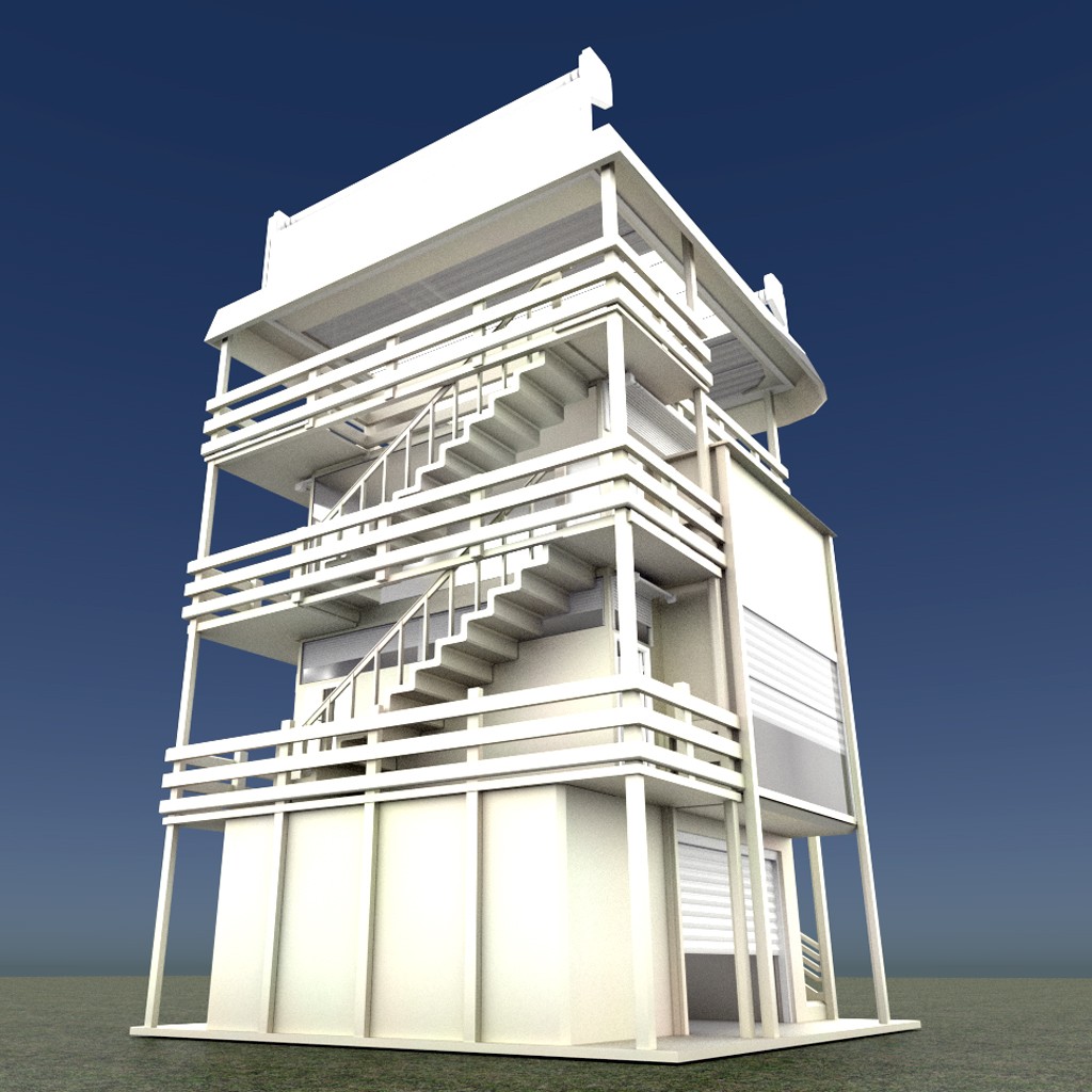 Here is my tower-house design with some window blinds and animated roller shutters.