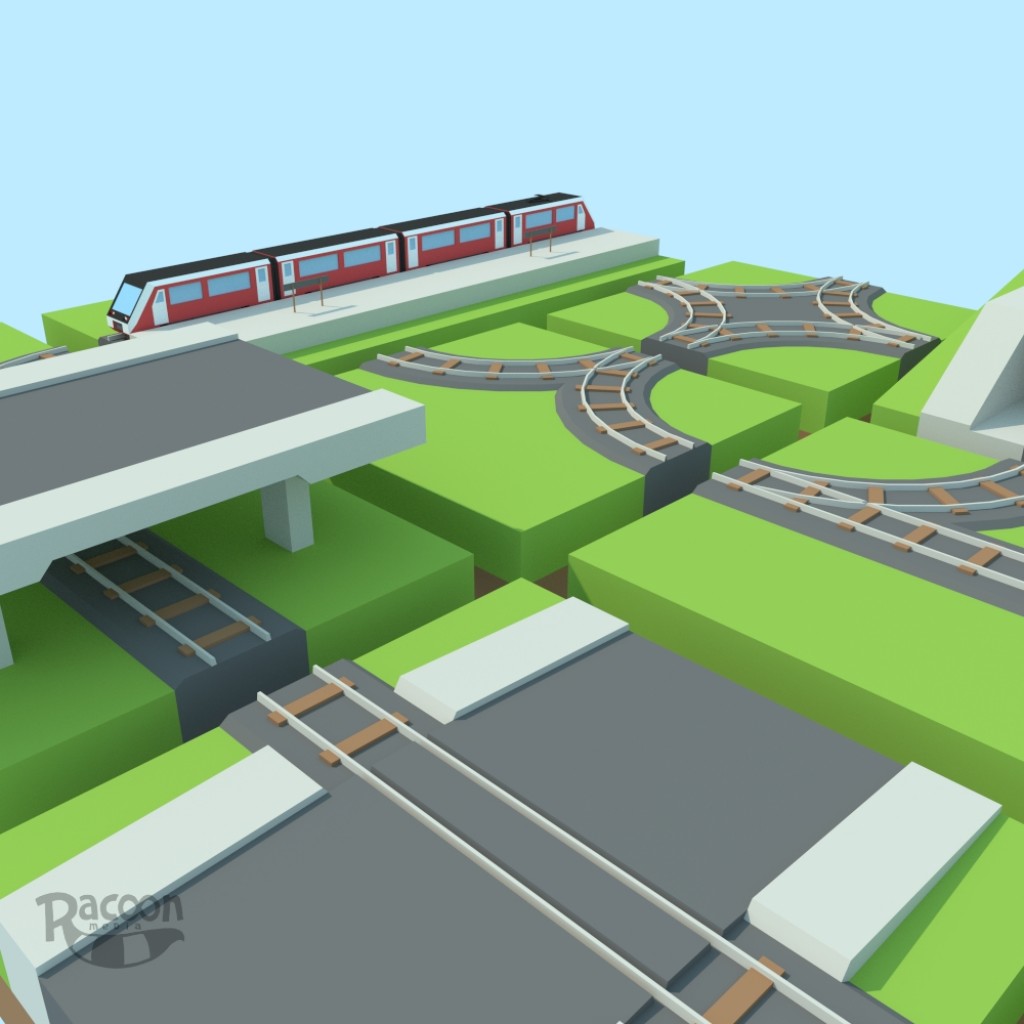 This railroad assets is an expansion for the landscape assets. It containes single tracked tiles, a train with 4 parts, a platform, bridge, road crossing and tunnel. The tiles can be mixed with all previously released assets to create more diverse and interesting mobility options. The train is unrigged and does not follow tracks. All tiles uses the same textures as previous assets.