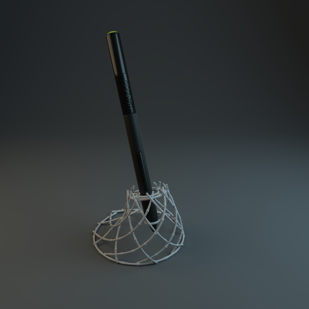 3d-printable stand for the Wacom's Bamboo graphical tablet pen. But it'll probably fit (with proper dimensions setting) for other tablets' pens, or even for regular pens and pencils.
