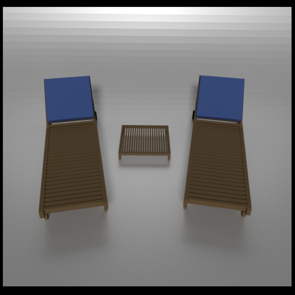 Two brown deck chair with blue pillow and a little table