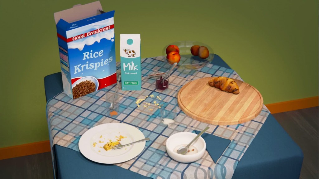 A complete and animated breakfast that disappears (leaving the crumbles behind) simulating its comsumption Contains also a compositing nodetree