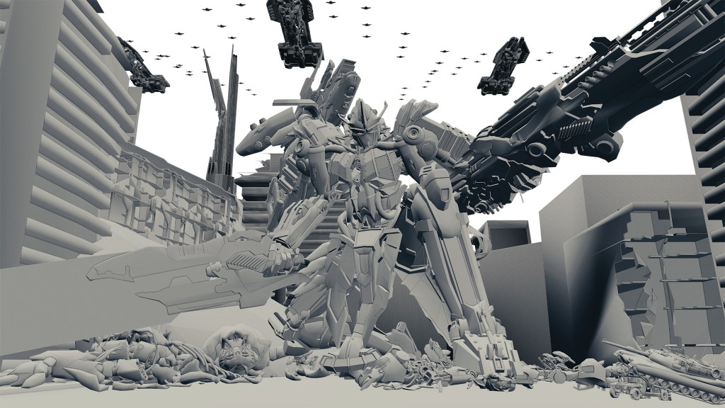 Know it's been a while, but I was looking at your scene and it's some really really impressive stuff! I noticed some of the background models like the dead robot and drones, etc. all have tris, and kinda look like they were ripped from a game. I think that's a good way to do backgrounds actually, and never really thought of that. Anyways, how did you get those and texture them? Seems like that would be quite a task to do!