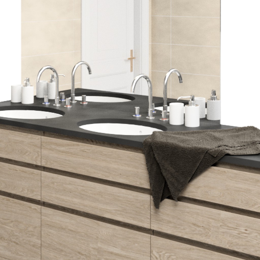 A bathroom cupboard with two sinks, a mirror, a towel made with particle system, a few cups and soap dispensers. Includes a few walls and a door for the mirror to have something to reflect. Hope you find some use for it or the parts from it.