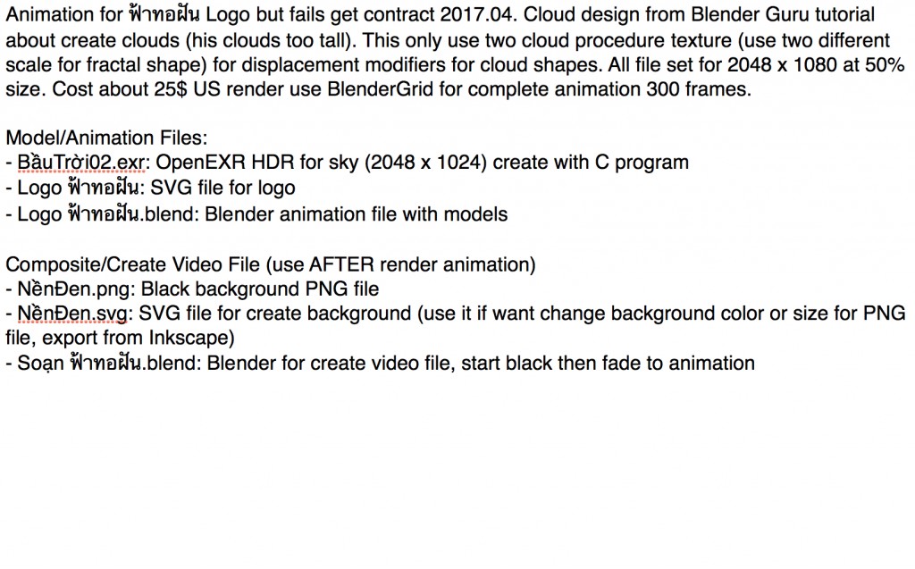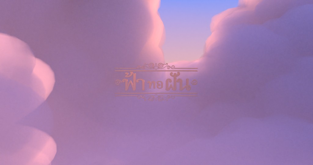 Animation for ฟ้าทอฝัน Logo but fails get contract 2017.04. Cloud design from Blender Guru tutorial about create clouds (his clouds too tall). This only use two cloud procedure texture (use two different scale for fractal shape) for displacement modifiers for cloud shapes. All file set for 2048 x 1080 at 50% size. Cost about 25$ US render use BlenderGrid for complete animation 300 frames.