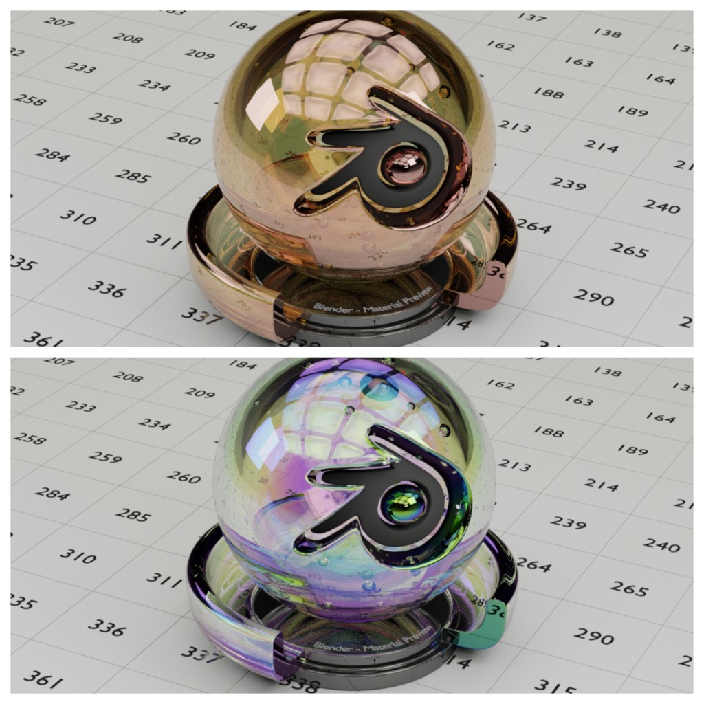 The interference node group inside calculates the Fresnel Reflectance of metals and thin-films of up to two layers. These calculations take into account both a material's real index of refraction, n, and imaginary index of refraction, k (together known as the complex refractive index), allowing for more accurate Fresnel and Interference colors.