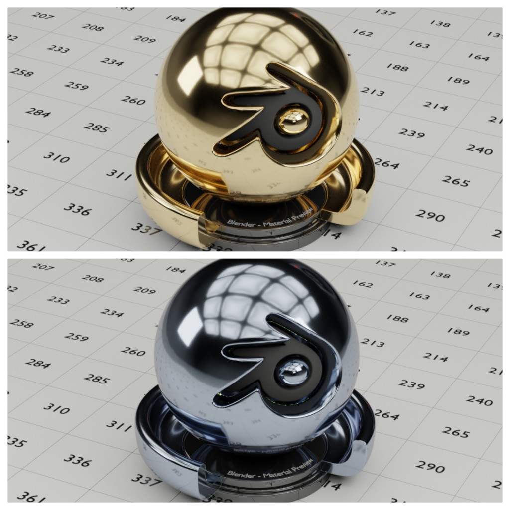 Included with the interference node group are various materials made with it including: metals (e.g. gold, silver, copper, and osmium), 12 car paints, oxide coated metals (e.g. tarnished silver and heated iron), coated glasses, and more. Other materials can be made using the known n and k values for each material, many of which can be found here: https://refractiveindex.info/