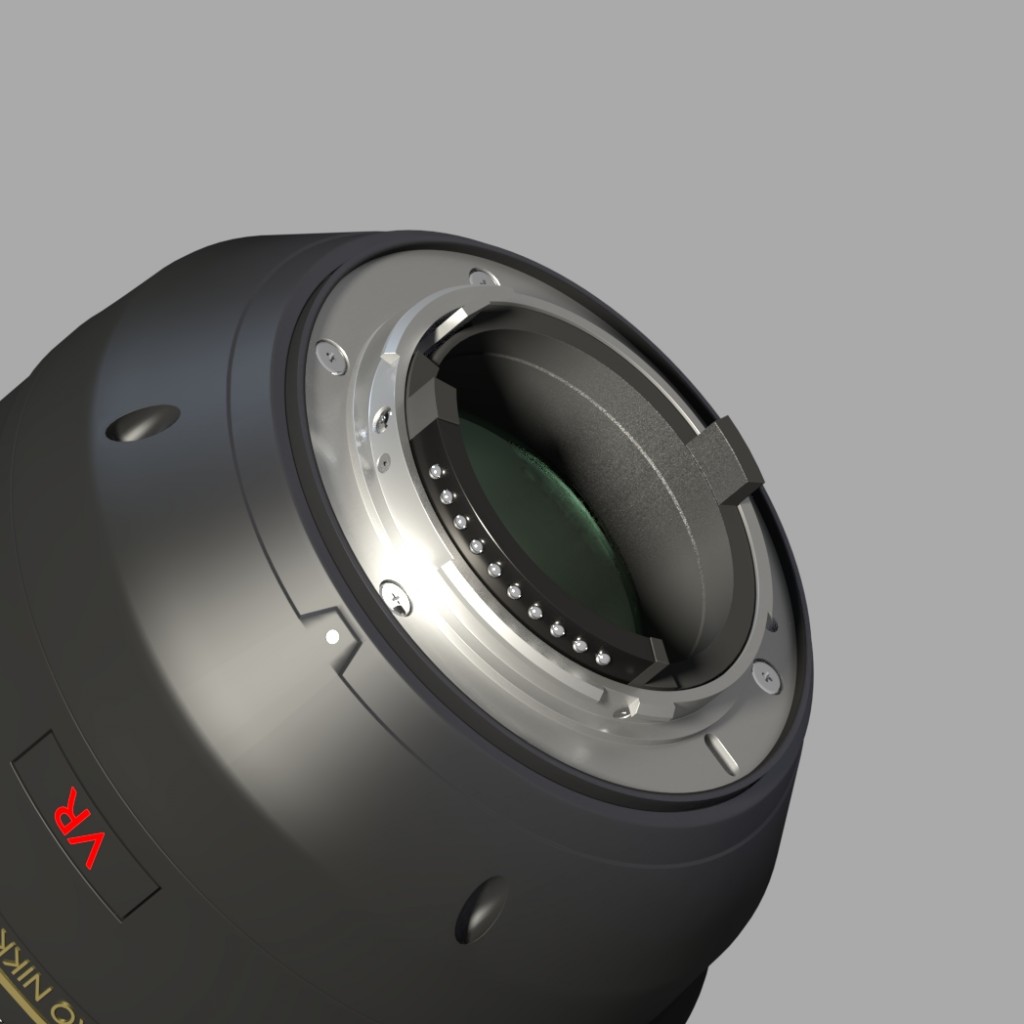 Nikon macro lens with hood. 105mm AF-S VR f/2.8G IF-ED. This lens has an "F" mount and can be used with any Nikon DSLR camera. It is dimensionally accurate but uses simple textures