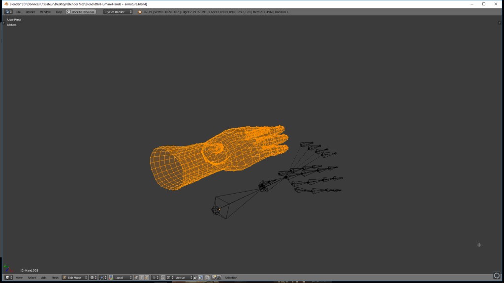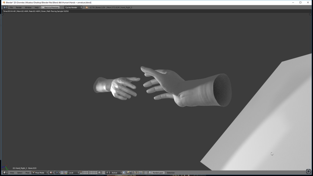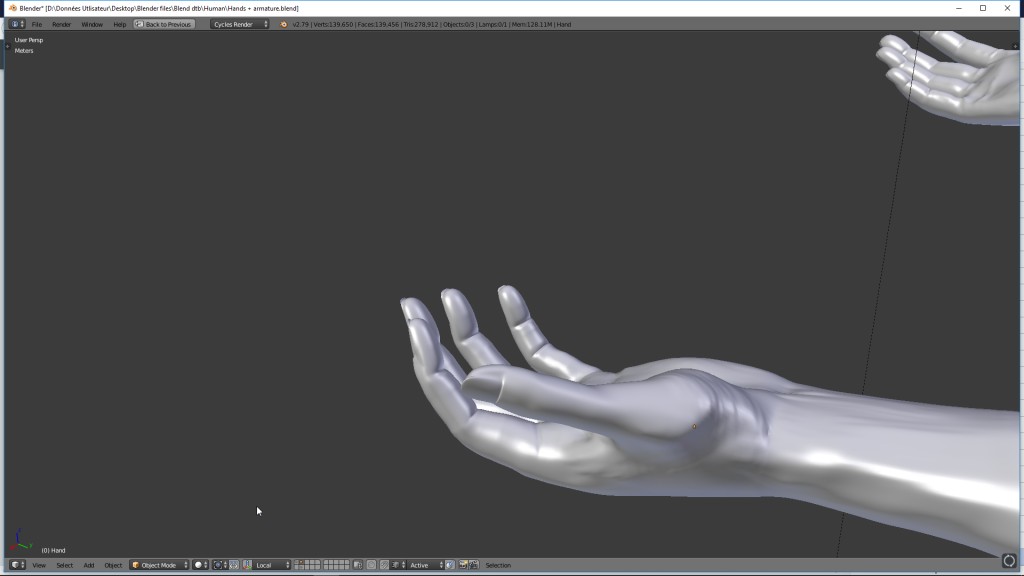 Left and Right human hands with a certain degree of realism. Working armature with a control bone for each individual fingers apart from the thumb. Each bone can be moved independantly. Takes a bit of work to get a good hand pose because hands have so many quirky positions in wich they can be found. No texture provided. The mesh is on a different layer than the armature. The left hand is feminine looking and the right hand is male looking.