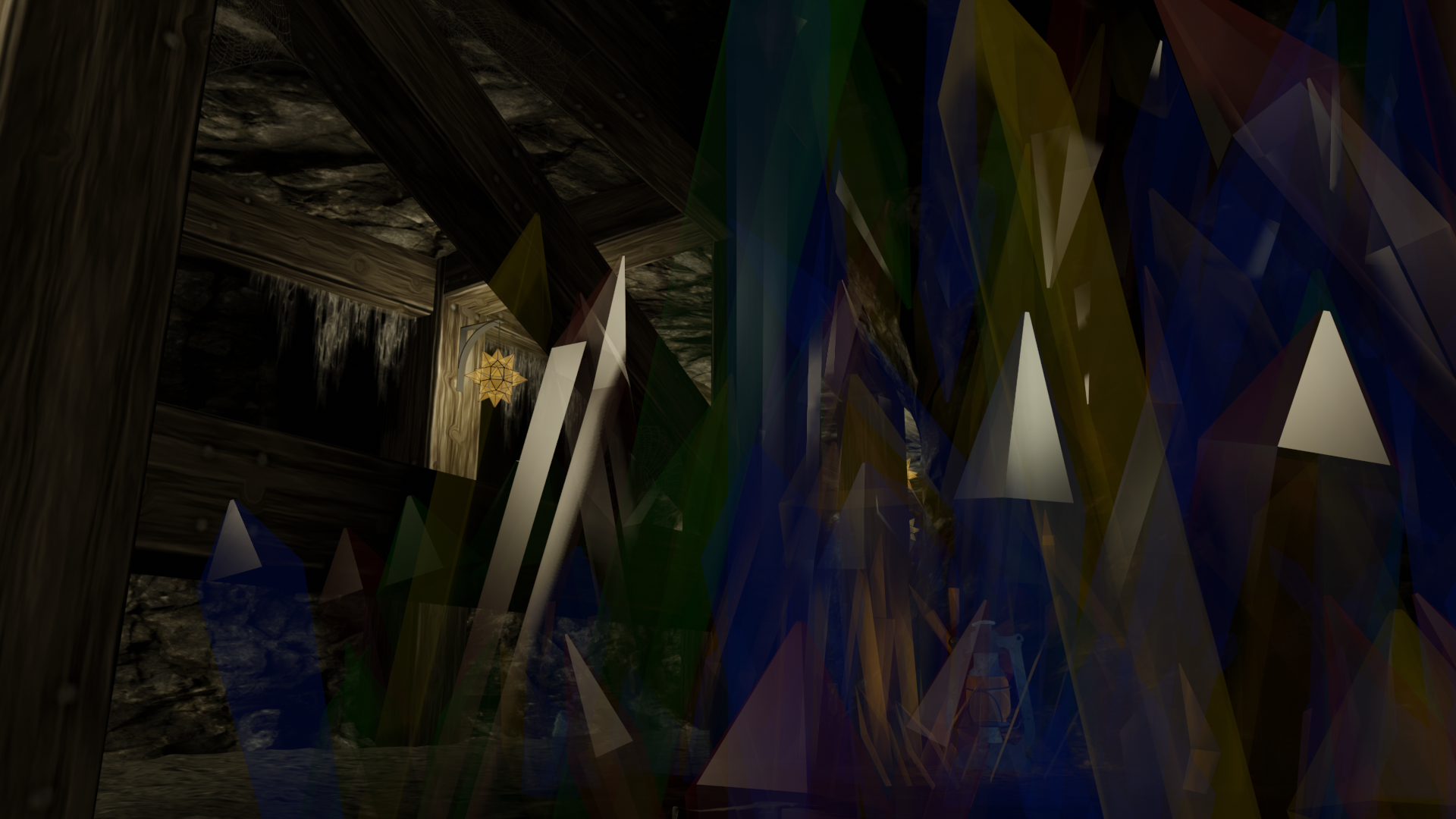Mine shaft with a lot of transparent objects: crystals, cobwebs and glass. I needed a scene with lots of transparent objects for a graphics algorithm I'm working on and this is the result. The materials are kept rather simple and I used 3 other blends as decoration (star lamp, petrol lamp, pickaxe)