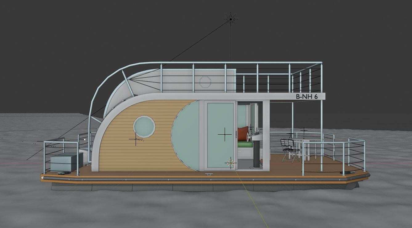 Houseboat brand Nautilus B-NH 6, some details may differ from the original model. In the scene, for optimal display, I turned off the subdivision and mirror in the modifiers tab. Most materials are taken from BlenderKit.