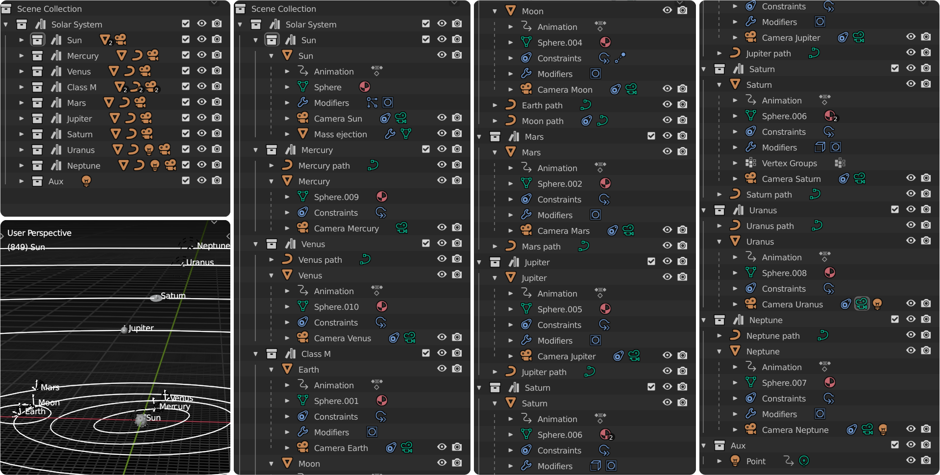 The scene gives you a glimpse of the vastness of our solar system, since selecting everything and hitting the "home"-button might lead to the need to increase your viewport camera's clipping values.