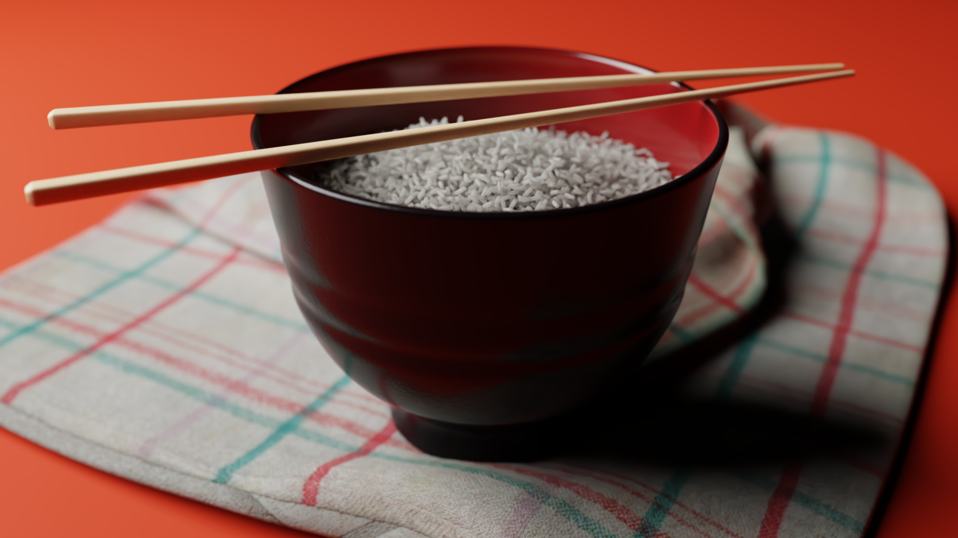 A model of a traditional rice bowl with chopsticks - the rice objects are parented to the bowl.