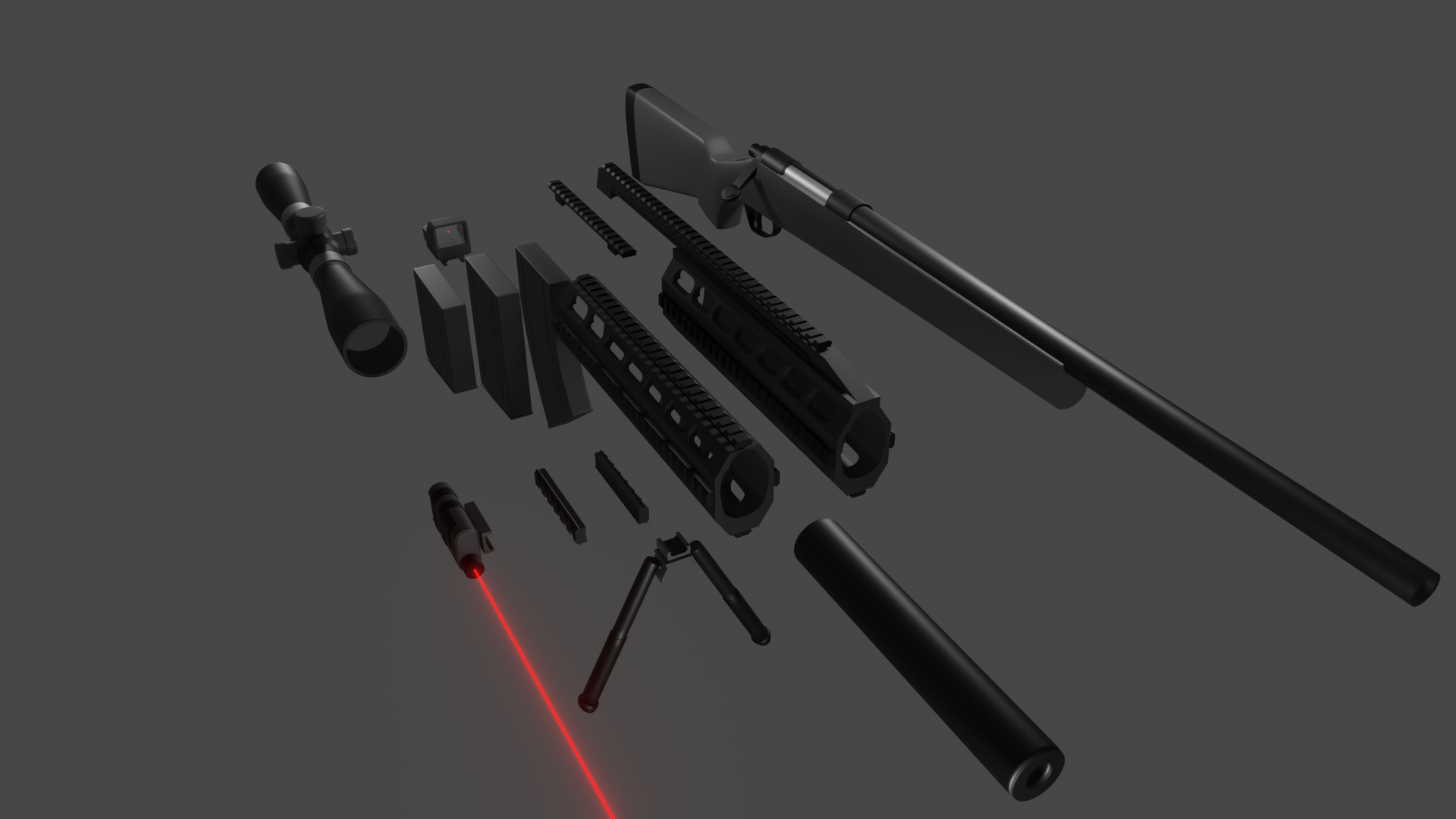 It already contains: - M24 Sniper Rifle - 2 different handguards (already added rails) - scope - red dot sight - 3 different magazines - silencer - bipod - laser sight - 3 rails for accessories/attachment