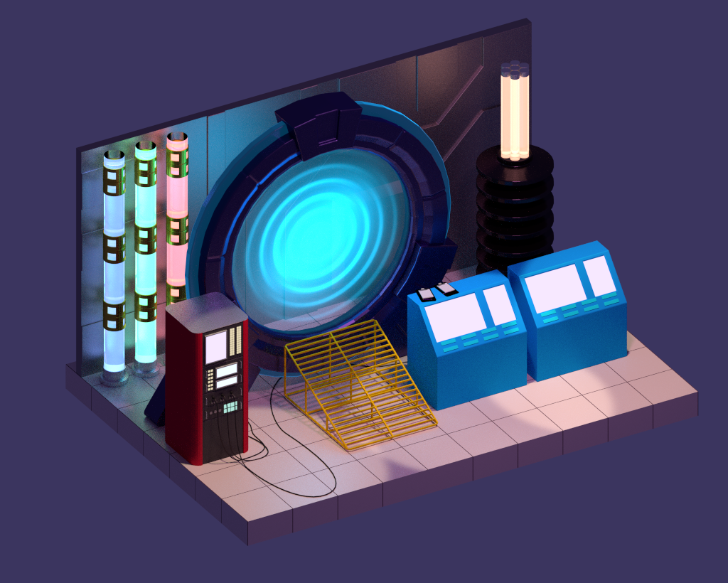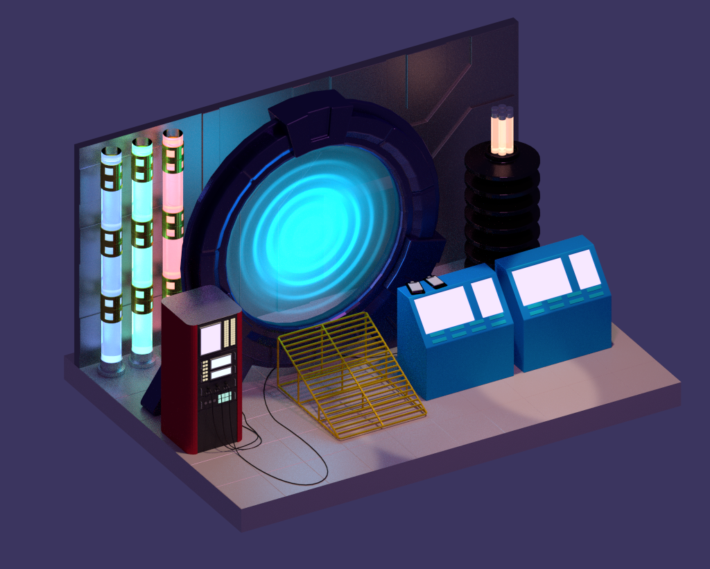 My version of Polygon Runway's 'Portal Environment'. This is high tech laboratory version. Also I use emission shader instead use point light for space/dimension door.