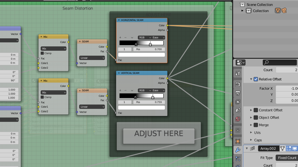 To make that seam vanish seamlessly (hehe), you duplicate the texture for itself using the color feature (see example image). Don't go too far with the intensity though. It's too much to even go beyond 0.4 tbh. Limit yourself to the default for the best result. For ease of use, I added an additional group with all those things setup called Global. The other one that is seamless, but use a gradient only, is called Single.