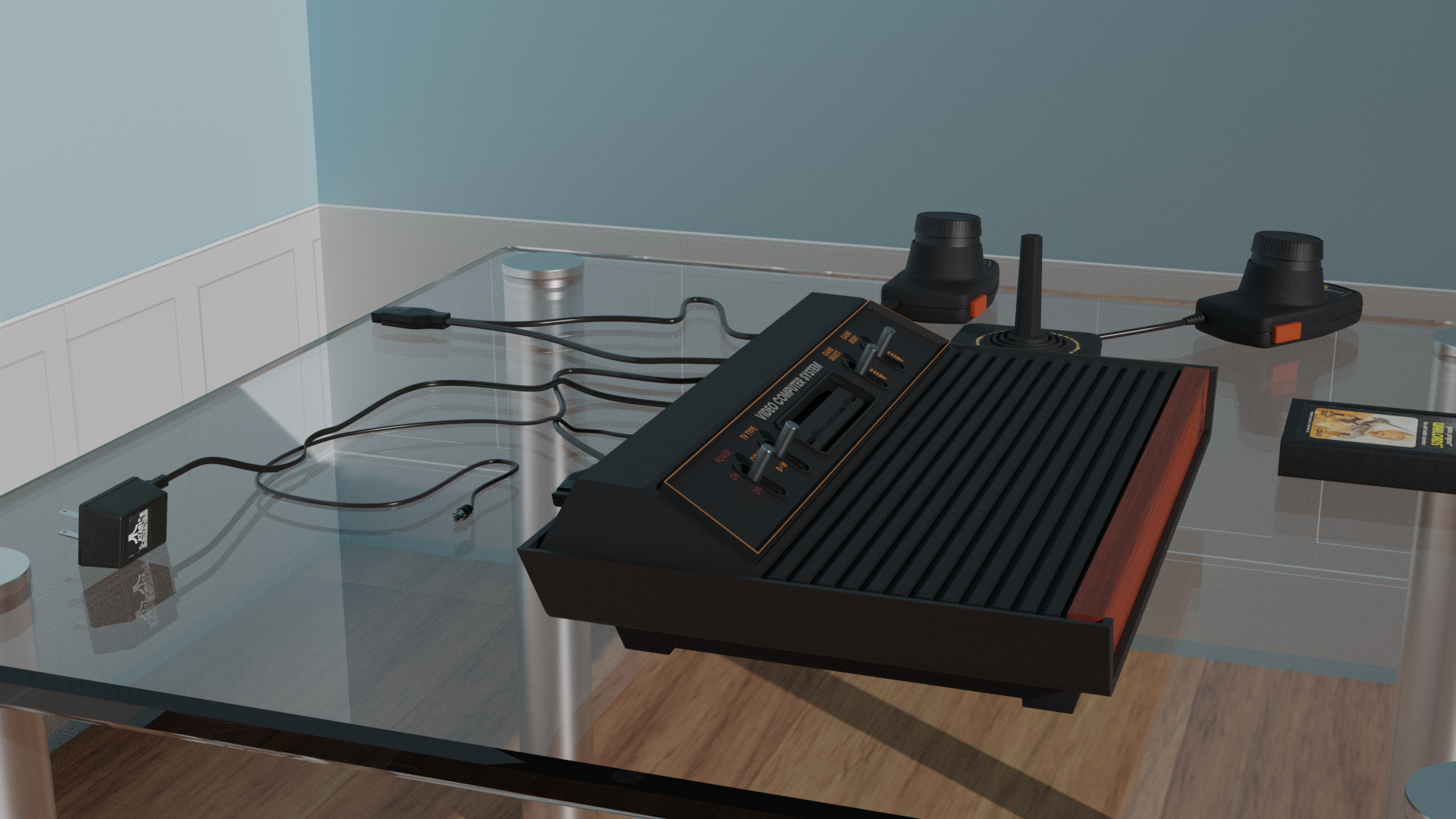 An Atari 2600 with paddle controllers and a stick controller with the game Warlords. All textures are from https://3dtextures.me/.