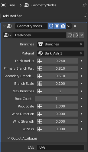This is a tree made with Blender's Geometry Nodes. Many features have been exposed in its Geometry Nodes modifier, which includes (but not limited to): * Tree base radius * Wind strength and direction Sample textures and branches are included in this file.