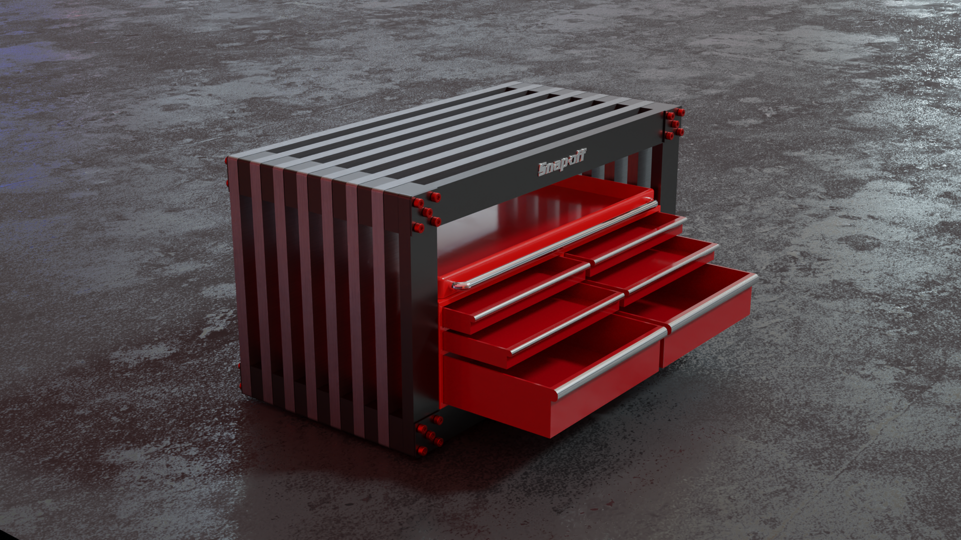 Workbench design made from rectangular steel tube, with tool box and moveable drawers.