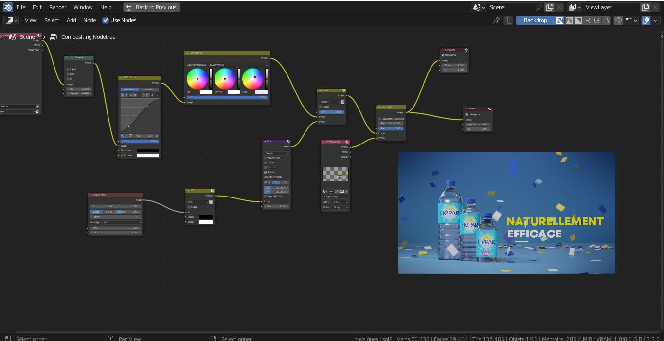 The scene is 20 Mo. It is a reproduction of the Hépar ad. Complete scene with cloth simulation and force fields of turbulence and force types, collision proxies are also present on the scene. The font (Font) is available in the file.