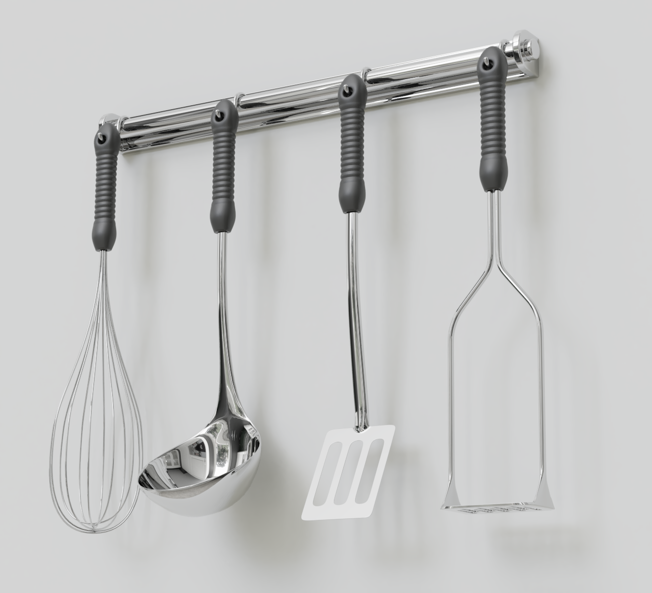 General Information: All objects use real world scale. To use the model in your scene simply append the collection named "kitchen_toolset_rail" and move it to the right place. All the parts are hierarchically parented, so i.e. moving a hook moves also the tool hanging on that hook, and moving the base of the rail moves all the toolset. The mesh object named "rail_base" is at the top of the parent tree, so use it as a handler when moving or rotating tis model along your scene.