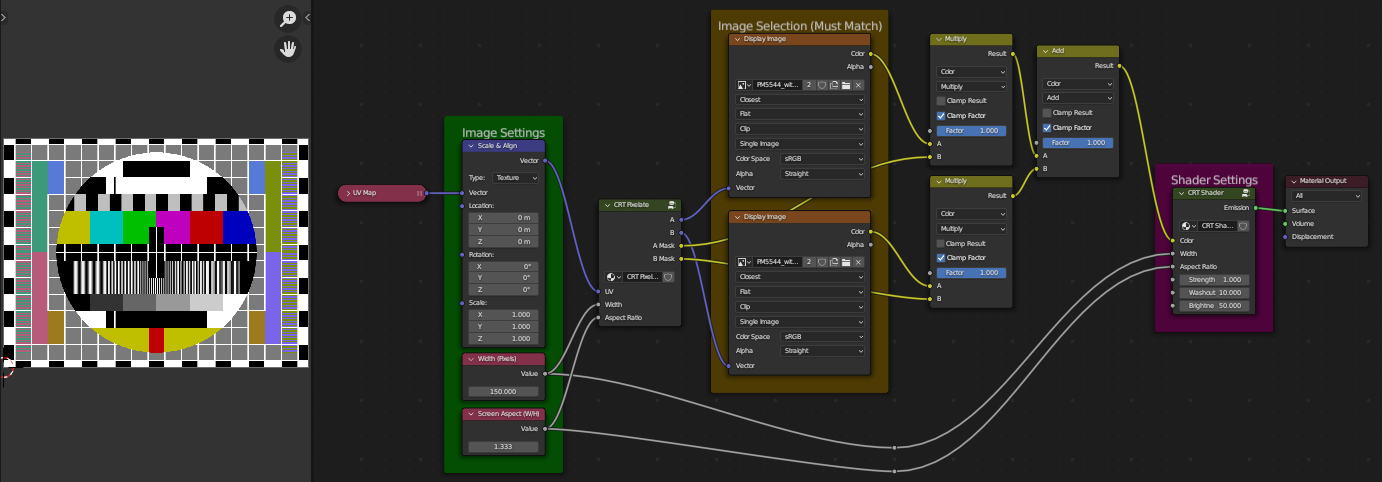 The CRT pixel effect is composed of two parametic node groups, one to pixelate the image and anohter to add the pixel filter effect. Just feed in your image texture, and it will update the screen! You can adjust pixel count and aspect ratio, move and scale your image texture, change the brightness of the display, and tweak how "washed out" the black pixels are. Play around with the settings to see what works best for you. Read the "Notes" tab for more info.