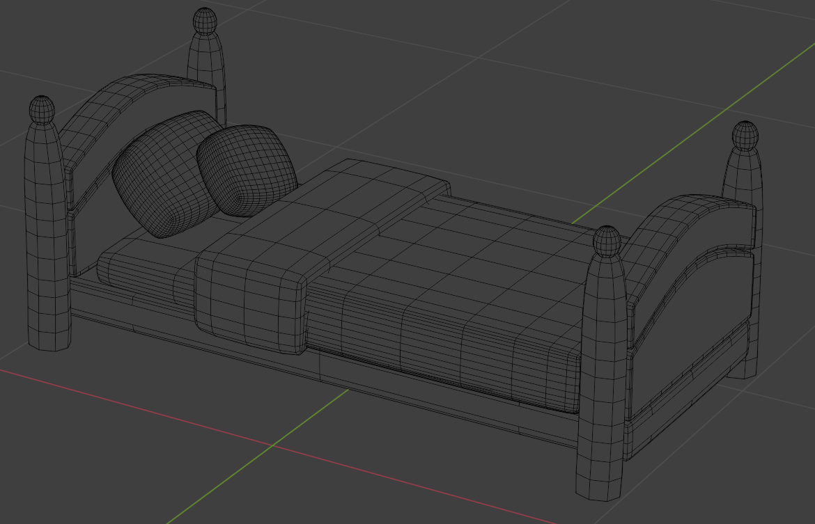 This 3D model of a single bed features a traditional design with a rounded headboard and posts at each corner. The bed is pictured with a light brown wooden frame and is fitted with a pastel colored mattress/sheet and pillows. The style is simple and conveys a warm and inviting atmosphere. The model is low poly.