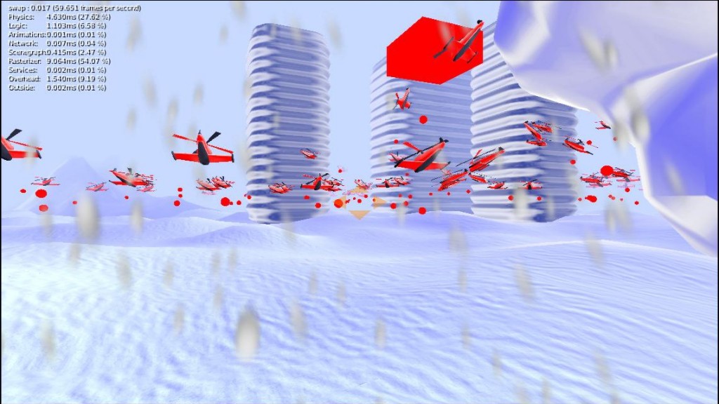 120 Helicopters Flying Around The Scene Trying To Avoid Obstacles. Just Another Test Scene For The Game Engine.